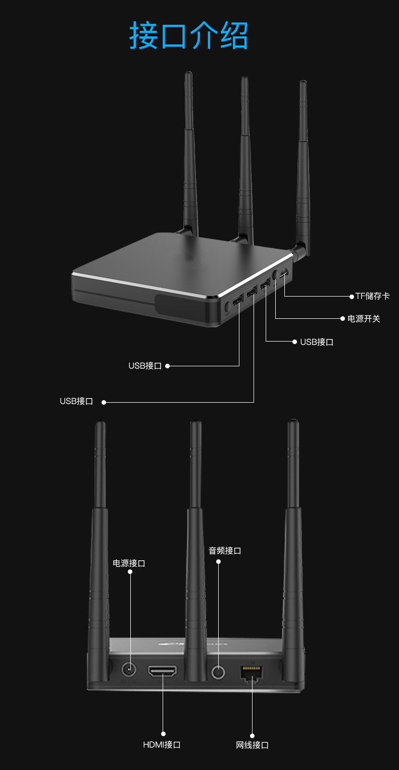 3,接收端內(nèi)置兩個(gè)wifi模塊,一個(gè)用于產(chǎn)生熱點(diǎn)用于傳屏,另外一個(gè)用于連接辦公室網(wǎng)絡(luò),無(wú)需連接網(wǎng)線(xiàn)使得連接熱點(diǎn)正在傳屏的移動(dòng)終端還能上網(wǎng),投屏上網(wǎng)兩不誤。